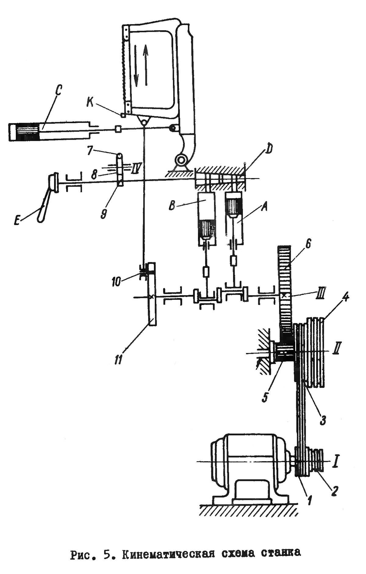 Рух от електродвигуна 1 передається посредством клиноременной передачи і двухступенчатых шкивов на приводной вал II. Шкив 4 і 5, овободно вращающийся на валу II, сблокирован о шестерней 6. Через зубчатую пару 6 і 7 рух передається валу III, на другом кінці которого закреплен кривошипный диск 12 з пальцем кривошипа.