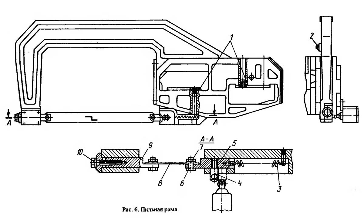 Пильная рама установлена на підшипники 8 і вставлена ексцентриками 6 в вертикальной плоскости. С боку пильная рама прижата к корпусу 2 щекой 1.