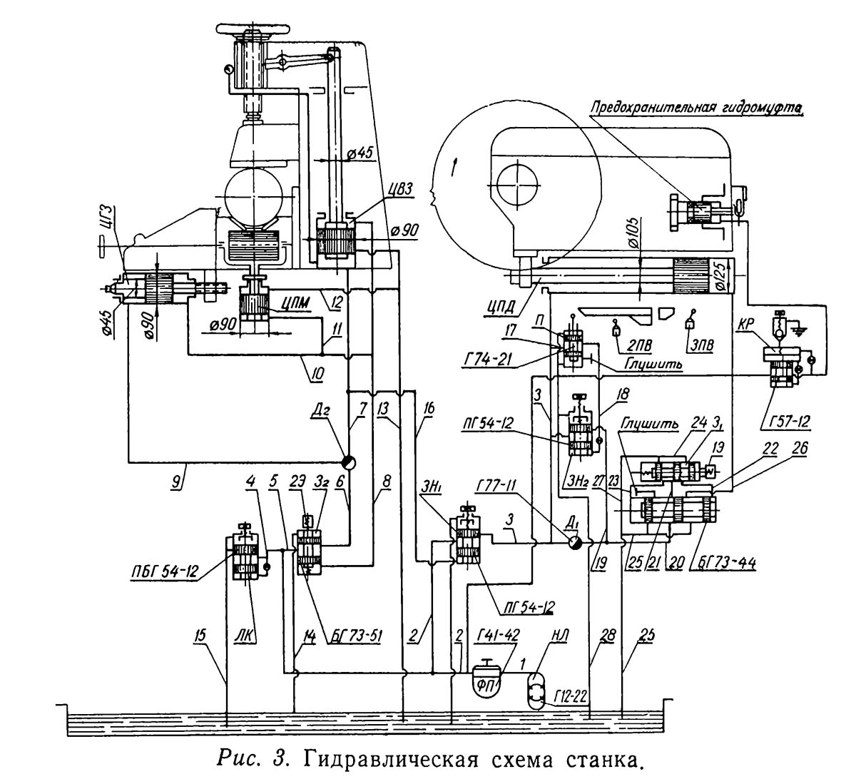 После того как поршни ЦВЗ, ЦГЗ і ЦПМ дошли до упора, давление в системе возрастает до величины налаштування напорного золотника ПК, который открывается, і весь объем масла по трубопроводам 4 і 15 идет на слив.