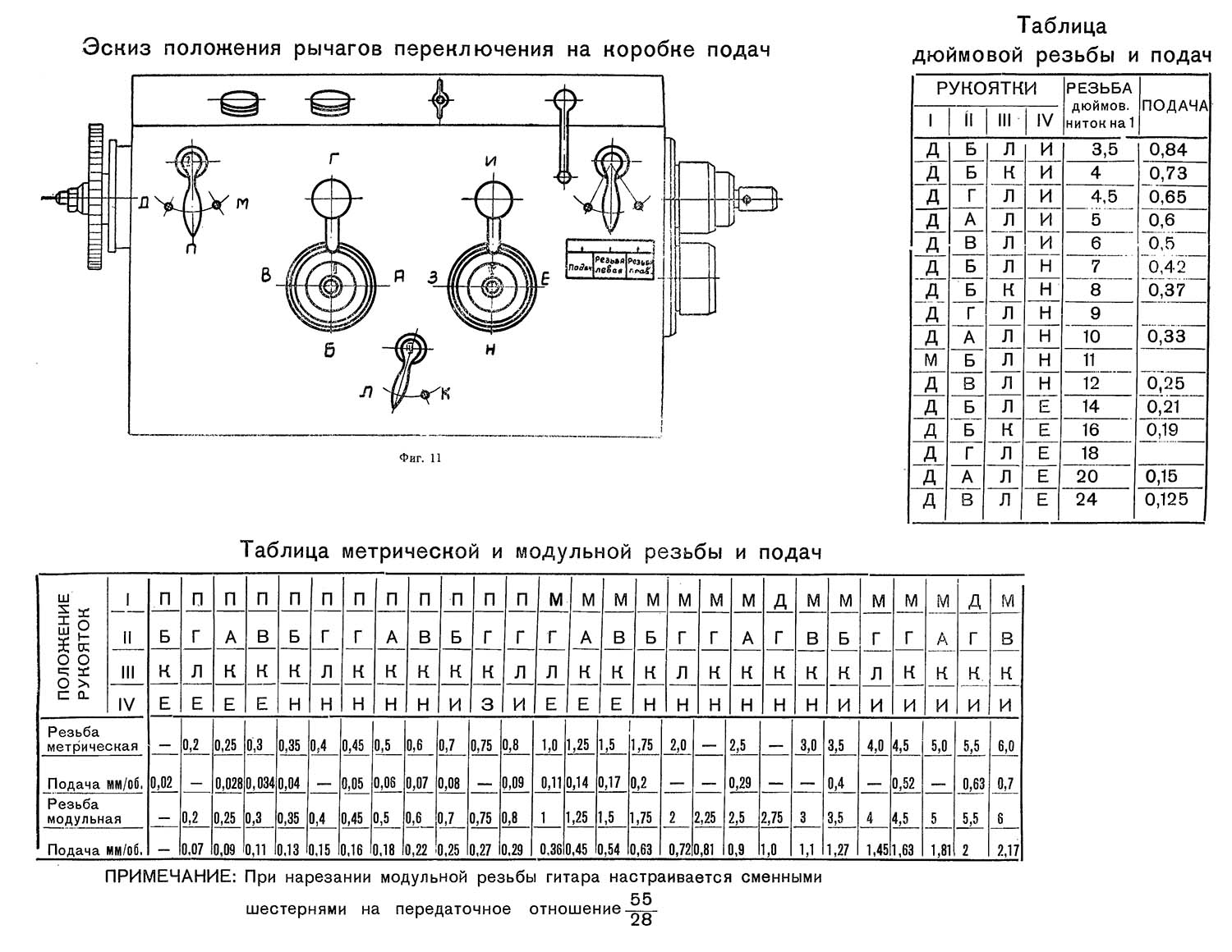 Для нарізання модульных різьб і різьб при прямом включении ходового гвинта на гітарі предусмотрена постановка сменных шестерен. В руководстве имеются указания по налаштуванні гітари на указанные різьби.