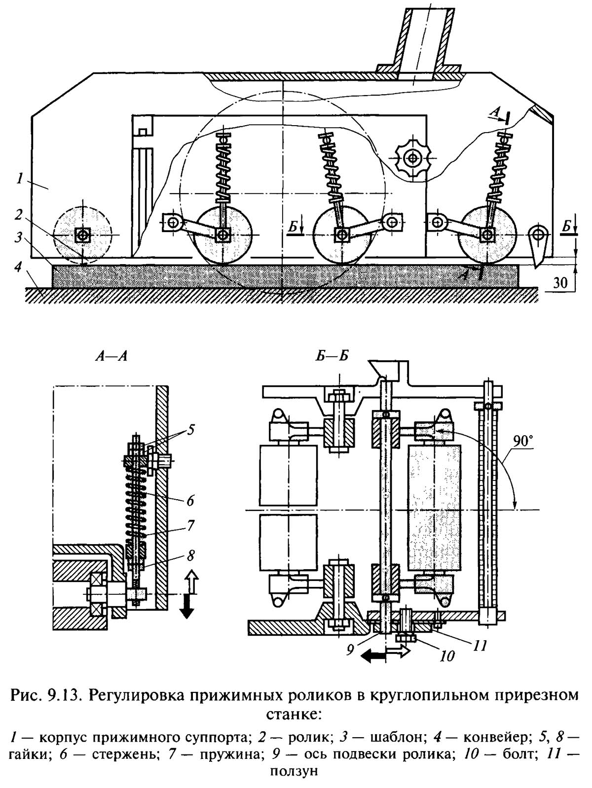 Положение роликов регулируют по высоте контрольным бруском или шаблоном (рис. 9.13). Шаблон 3 устанавливают на конвейер 4 і опускают прижимный супорт так, чтобы между нижней поверхностью корпуса 1 і шаблоном образовался зазор 30 мм. Вращая верхние гайки 5, удлиняют или укорачивают рабочую часть стержней 6 подвески прижимных роликов і добиваются, чтобы ролики касались поверхности шаблона. Величину натяга или ослабления пружин 7, прижимающих ролики к обрабатываемому материалу, регулируют, вращая нижние гайки 8. При пилении древесины твердых пород натяг следует увеличить, а мягких —уменьшить.