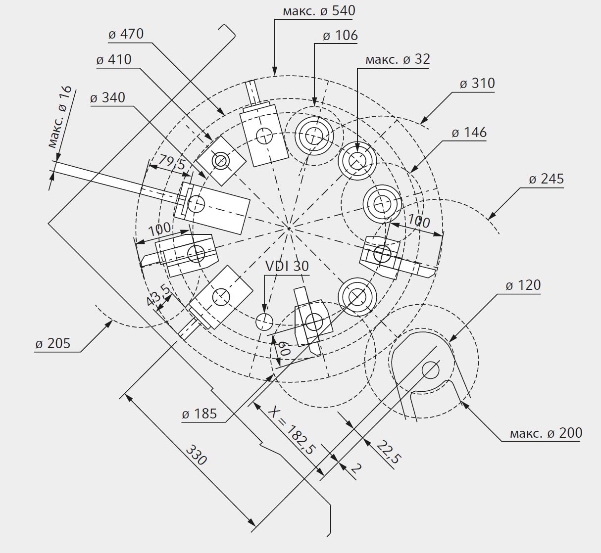 Інструментальний револьвер із приводним інструментом Револьверна головка з 12 інструментальними позиціями. Вибір позиції здійснюється за найкоротшим кутом повороту. Інструментоутримувачі DIN 69880 (VDI 3425) з циліндричним хвостовиком ø 30 мм. Привід для 12 позицій, хвостовик приводних станцій DIN 5480 W16x0,8x30x18). 11 пластикових заглушок для гнізд VDI.