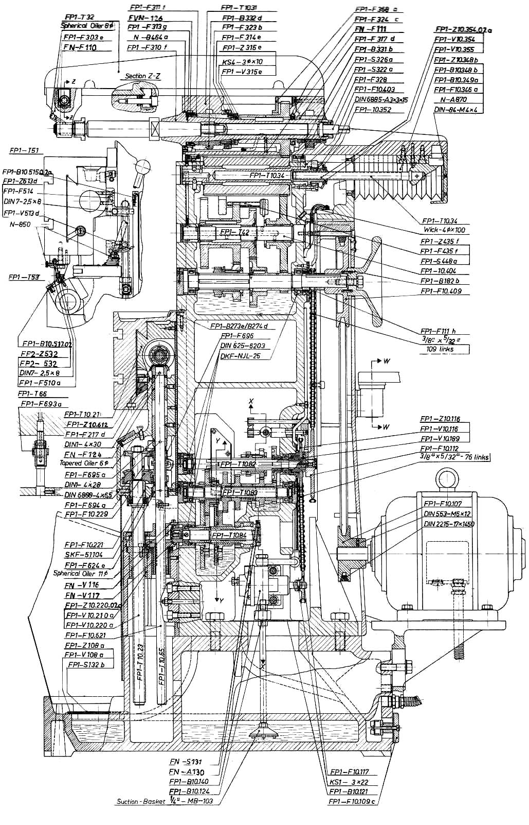 Кінематична схема фрезерного верстата Deckel FP1. Дивитись у збільшеному масштабі