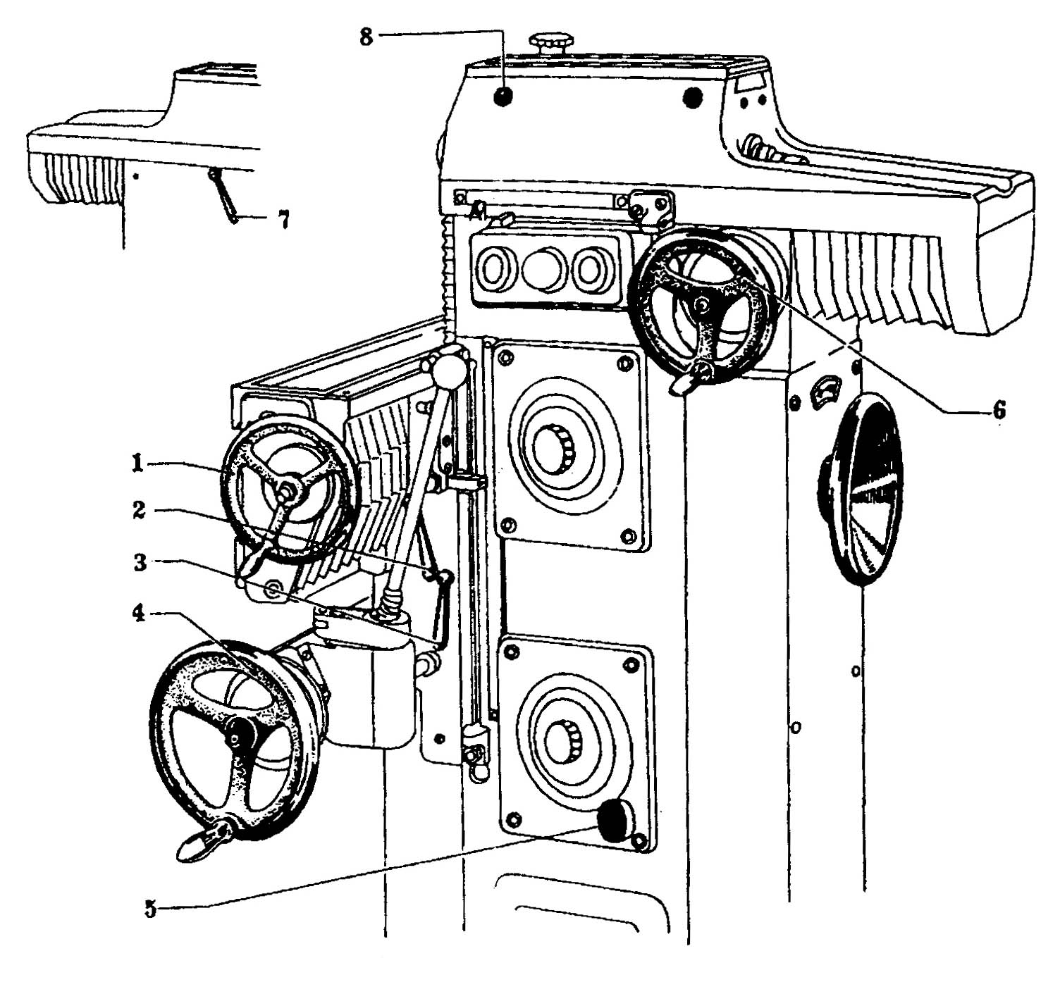 Маховичок 10 на защитном кожухе (на задньої стороне верстата) облегчает увімкнення шестерён при установці числа оборотів і швидкостей подачі, а также служит для обертання вручную фрезерного шпинделя.