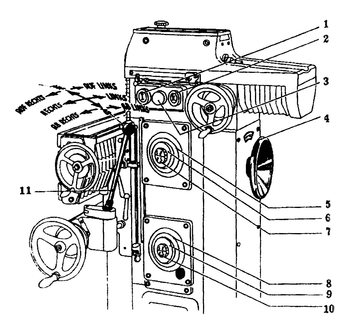 При помощи одного только рычага 4 можно включать в одном месте все механические подачі робочого стола, причем пути, совершаемые рычагом «налево - направо» і «вверх - вниз», соответствуют направлениям переміщення робочого стола.