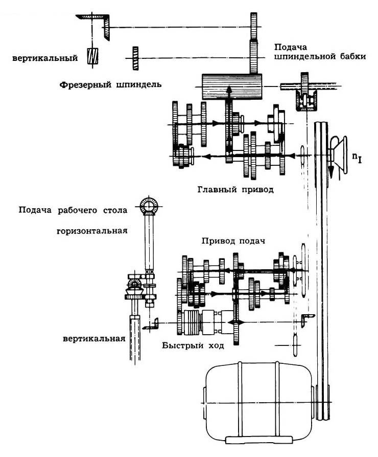 2. Кінематична схема фрезерного верстата Deckel FP2. Дивитись у збільшеному масштабі