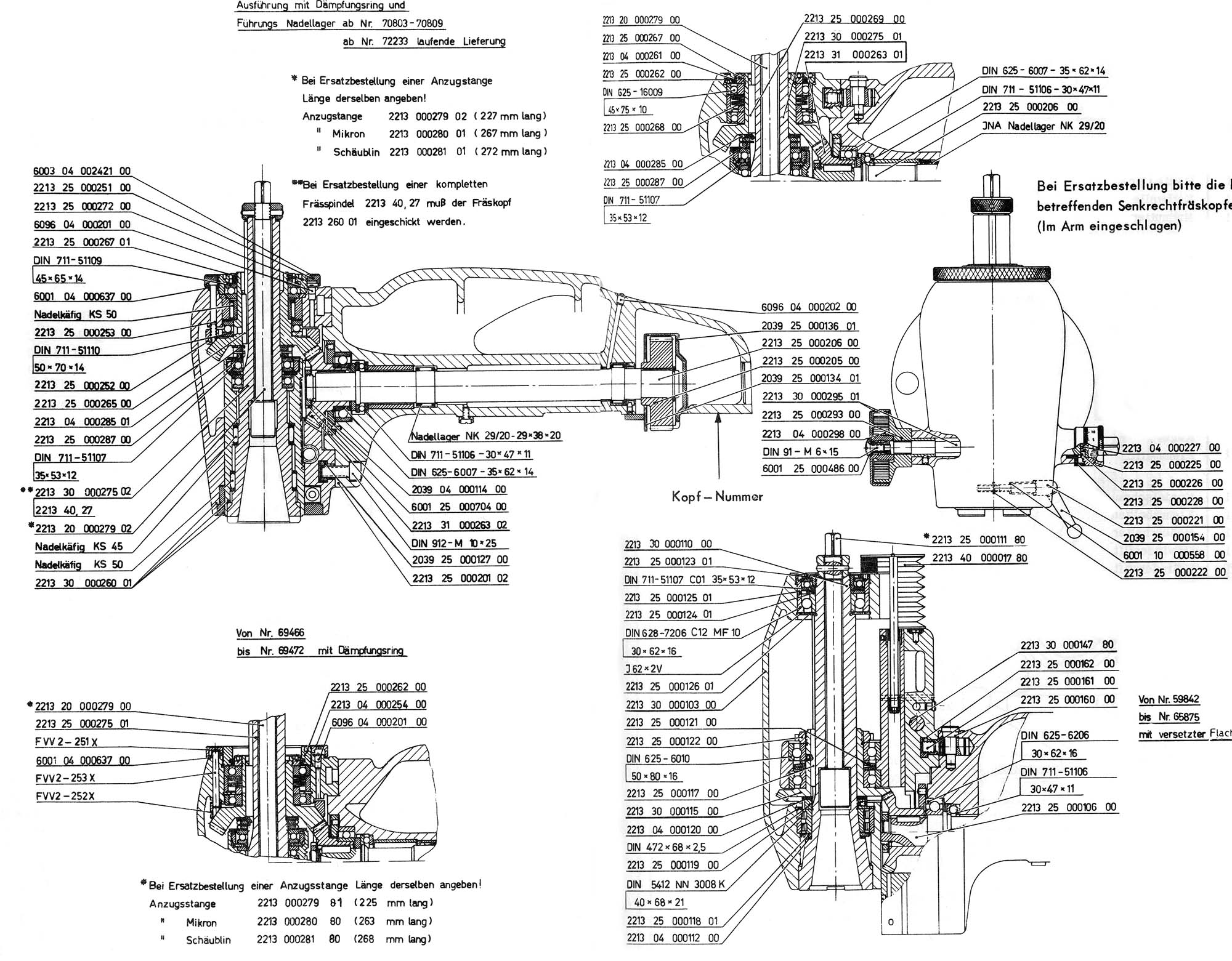 Установка упоров для вертикального переміщення суппорта производится на направляющей стойки со стороны дверцы, для продольного переміщення робочого стола — на нижней стороне робочого стола, а для переміщення шпиндельной бабки — на стойке со стороны дверцы. Во всех трёх случаях для ограничения ходу соответствующих ходовых винтов служат два внешних неподвижных упора. Два переставных упора могут устанавливаться в пределах етого максимального переміщення для желаемого ограничения пути подачі. Дополнительный упор по высоте 1 обеспечивает - особенно при вертикальном фрезеровании штампов - равномерную остановку фрезы у основания штампа (см. стр. 46, абз. 5).