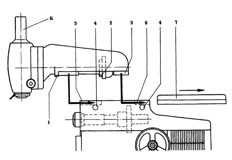 При помощи одного только рычага 4 можно включать в одном месте все механические подачі робочого стола, причем пути, совершаемые рычагом «налево - направо» і «вверх - вниз», соответствуют направлениям переміщення робочого стола.