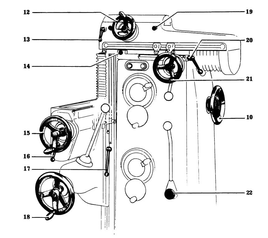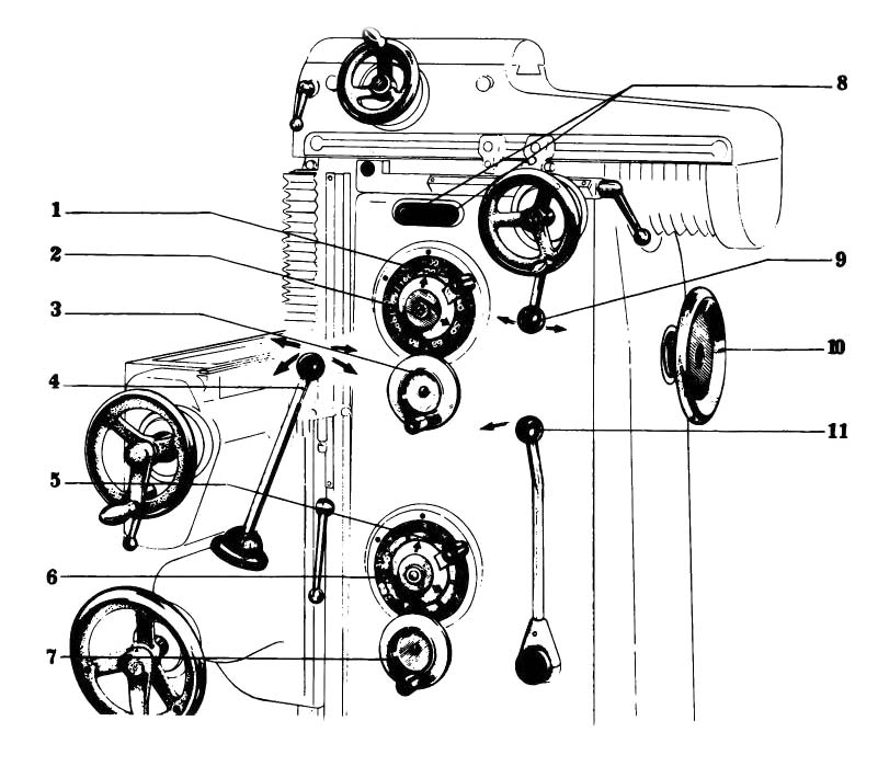 Маховичок 10 на защитном кожухе (на задньої стороне верстата) облегчает увімкнення шестерён при установці числа оборотів і швидкостей подачі, а также служит для обертання вручную фрезерного шпинделя.