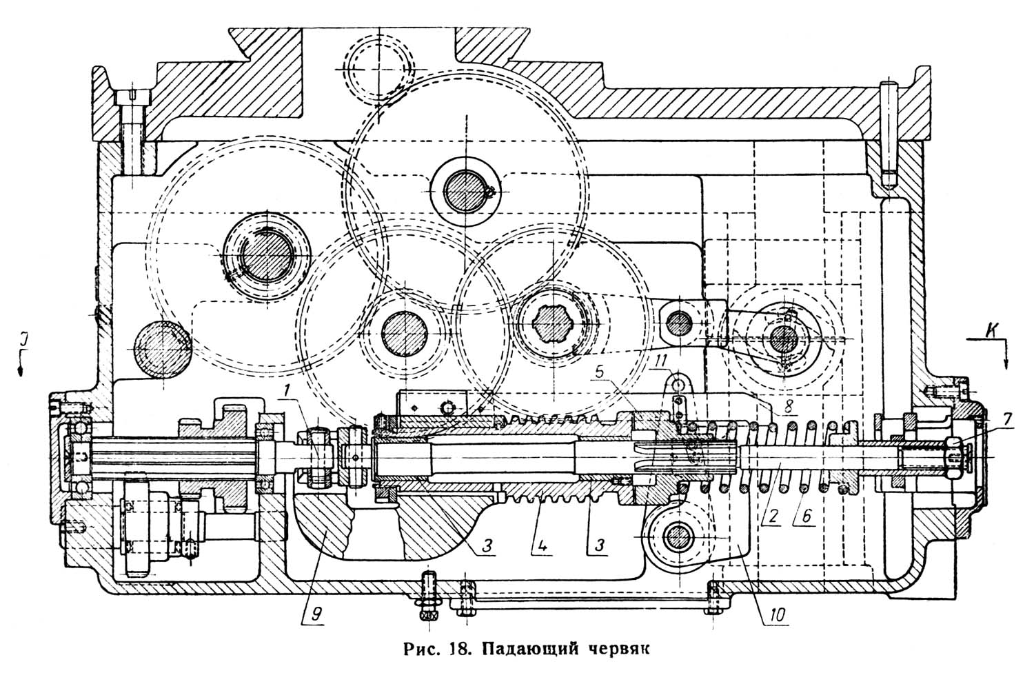 Рух передається от ходового валика через цилиндрические шестерни і шарнир Гука 1 на валик 2, который свободно вращается в бронзовых втулках 3 шестизаходного червяка 4. При выходе из отверстия червяка валик переходит в шестишпоночный, по шлицам которого може перемещаться муфта 5, имеющая винтовые выступы-кулачки. Правый конец червяка 4 также снабжен винтовыми выступами, к которым прижимаются винтовые кулачки муфты 5, находящейся под воздействием пружины 6. Нажатие пружины 6 регулируется гайкой 7.