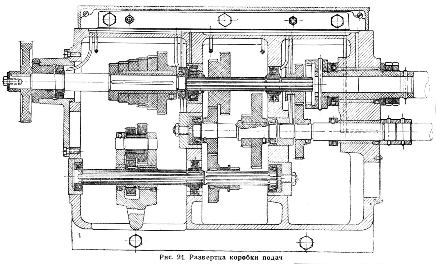 Конструкція механізма коробки подач дает возможность путем переключения шестерен получить большое количество различных видов різьб і подач. Переключения производятся передвижением шестерен рычагами по шестишпоночньим валикам.