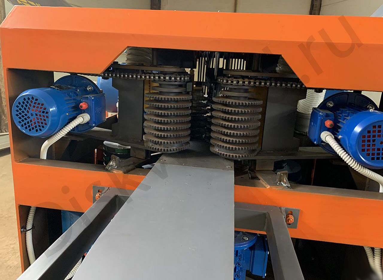 Полученный двухкантный брус (лафет) подаётся в многопильный узел двухвального типа.