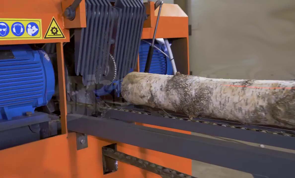 После налаштування верстата і положения бревна бревнотаска, оснащённая цепным приводом, подает бревно в верстат.