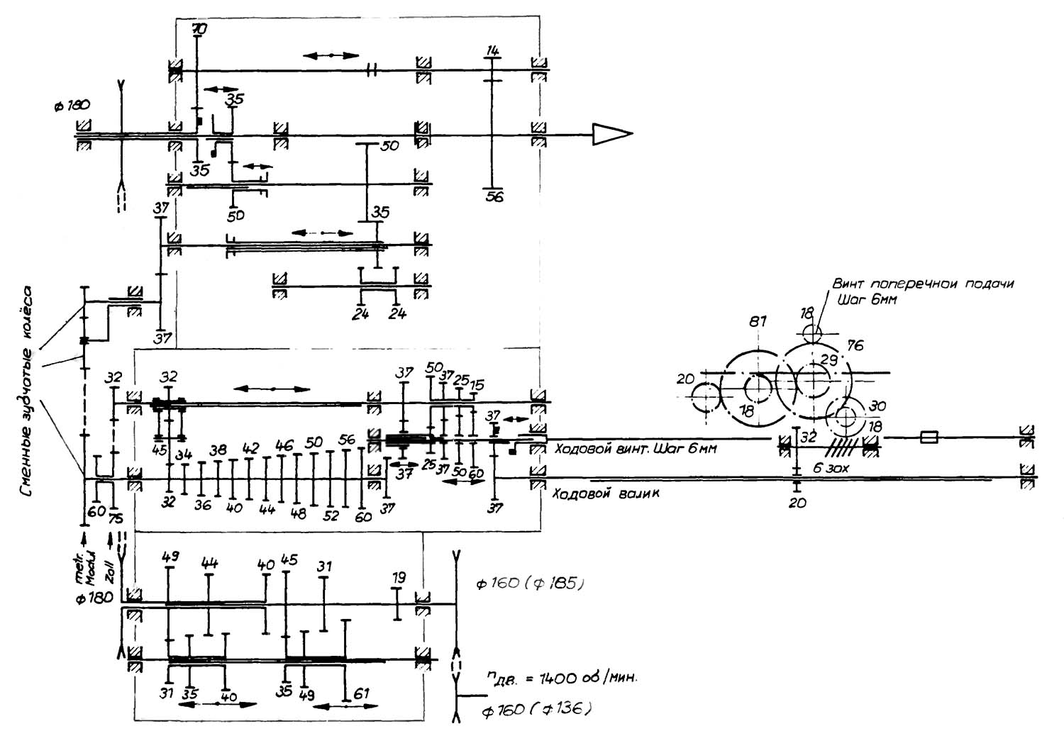 Важель 7 встановлюється відповідно до виду різьблення дюйми, міліметри або модулі /мм/. За допомогою важеля 8 може бути вибірково включений гвинт ходовий або ходовий вал. Ходовий вал служить для поздовжнього та поперечного обточування, а також для нарізки спірального різьблення; ходовий гвинт служить тільки для нарізки довгих різьблень.