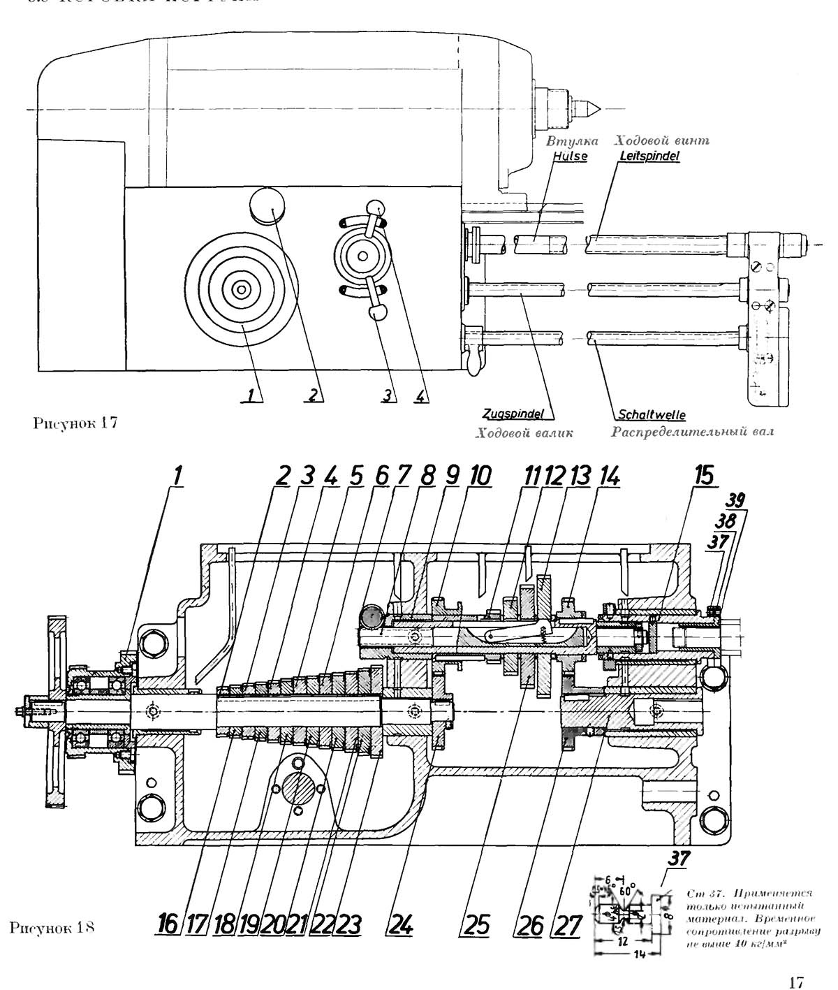 Через реверсивну передачу 7 і змінні шестерні 8 приводиться в рух механізм 9 приводу. Механізм приводу складається з 13-ступінчастої передачі Нортона і 4-ступінчастої передачі з витяжною шпонкою. Без перестановки змінних шестерень можуть бути встановлені 52 різні різьблення або подачі. За допомогою використання змінних шестерень, що поставляються разом зі верстатом, можуть нарізатися метричні різьблення з кроком від 0,2 до 30 мм, дюймові різьблення з 1/2 до 60 витків на дюйм і модульні різьблення з модулем від 0,25 до 30. З міркувань більшої наглядності подач на верстаті містить лише набір найважливіших подач та кроків різьблення. Повний перелік усіх можливих подач та кроків різьблення Ви знайдете на сторінках до цих вказівок з експлуатації.