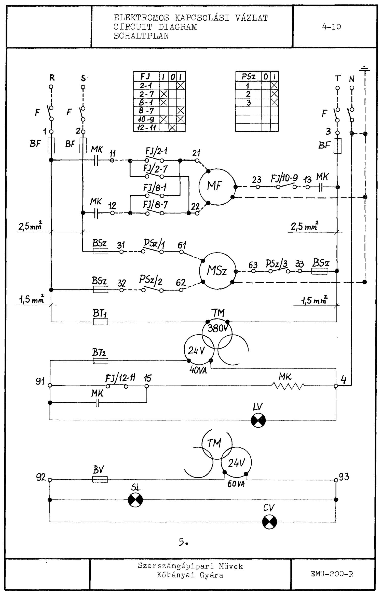 Для полегшення огляду з'єднань на рис. 5 показується принципова схема електроустаткування верстата. Мережа підключається до клем RST клемної колодки. Захист верстата від короткого замикання здійснюється плавкими запобіжниками. Двигун насоса та трансформатор також захищаються запобіжниками.