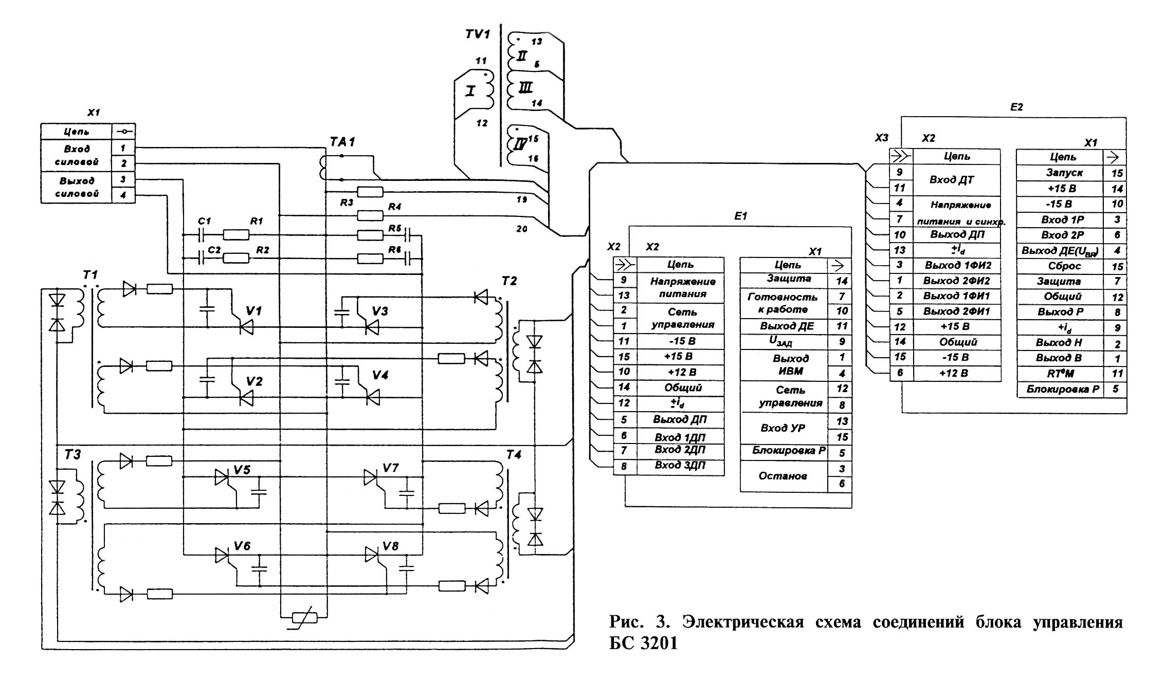 Електрична схема соединения блока керування БС 3201 приведена на рис. 3. Блок керування БС 3201 состоит из силовой частини і системы керування. Система керування содержит блоки керування Е1 і Е2.