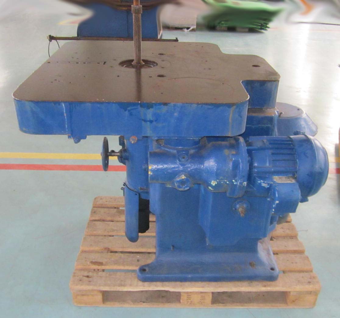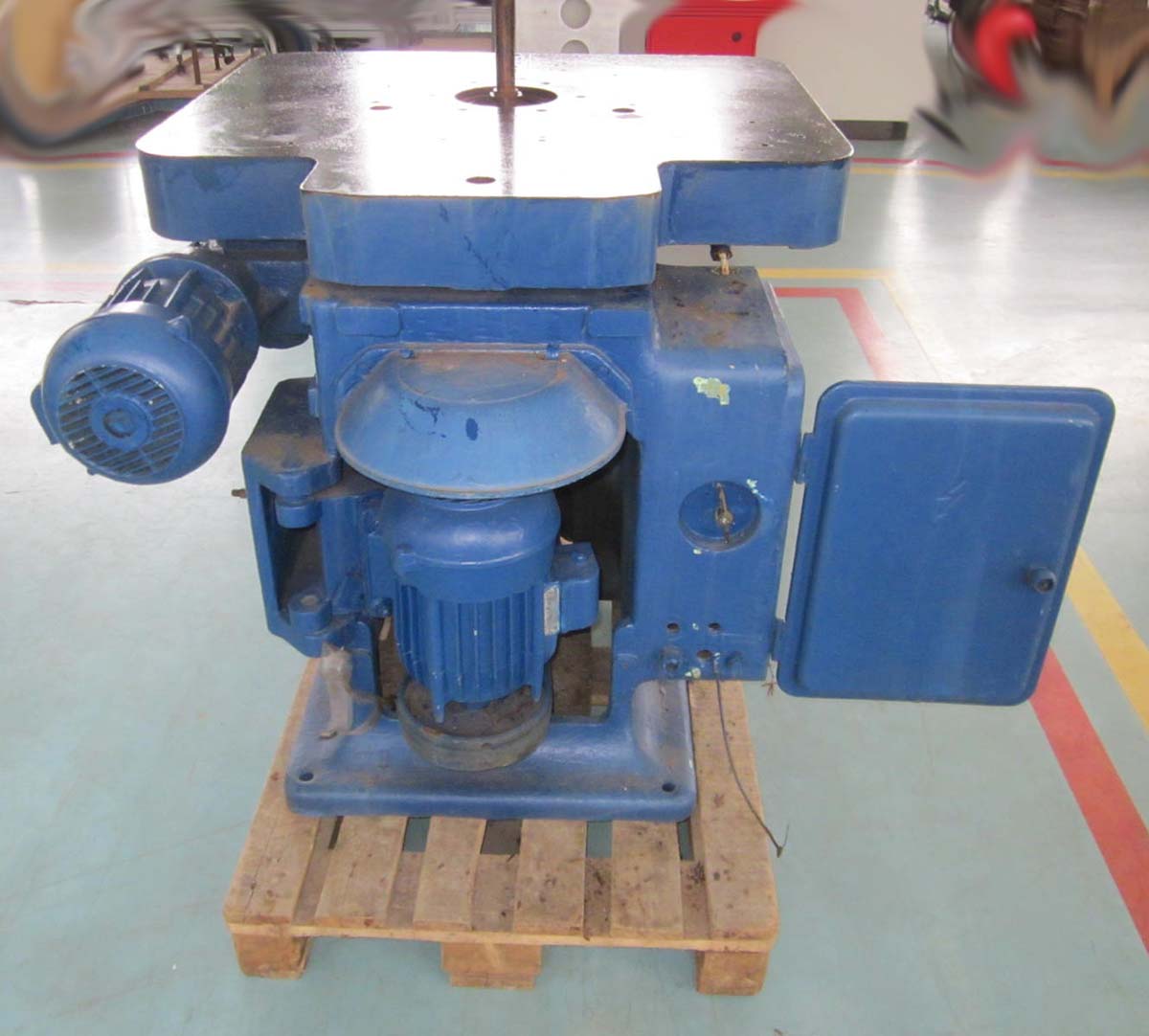 Шпиндель-вал при помощи суппорта можно поднимать, опускать і в нужном положении закреплять стопорным винтом. В верхний конец шпиндельного вала вставлен рабочий вставной шпиндель, па котором укрепляют режущий инструмент. Верхня часть вставного шпинделя входит в укрепленный на кронштейне шарикоподшипник. Такая конструкция шпинделя обеспечивает его вращение і работу режущего инструмента без вибрации. Число оборотів шпинделя в минуту 6000..8000, диаметр инструмента 80..150 мм, размер стола 1000 X 800 мм, его высота 900 мм. мощность електродвигуна шпинделя 4,5 кВт, вес верстата 635 кг. Приводится шпиндель-вал во вращение непосредственно от вала електродвигуна или через ременный привод.