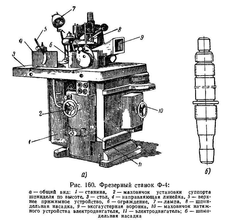 Фрезерный верстат ФШ-4 з шипорезной кареткой является модификацией верстата Ф-4. Он предназначен для выполнения разнообразных фрезерных работ по плоскости і профилю і для простых шипорезных работ. Основні частини верстата: нерухомий стол, установленный на станине, шпиндельна бабка со шпинделем, перемещаемая по направляющим станины в вертикальном направлении, і шипорезная каретка. Шпиндель имеет правое вращение, которое применяется при шипорезных работах, і левое — при фрезерных работах.