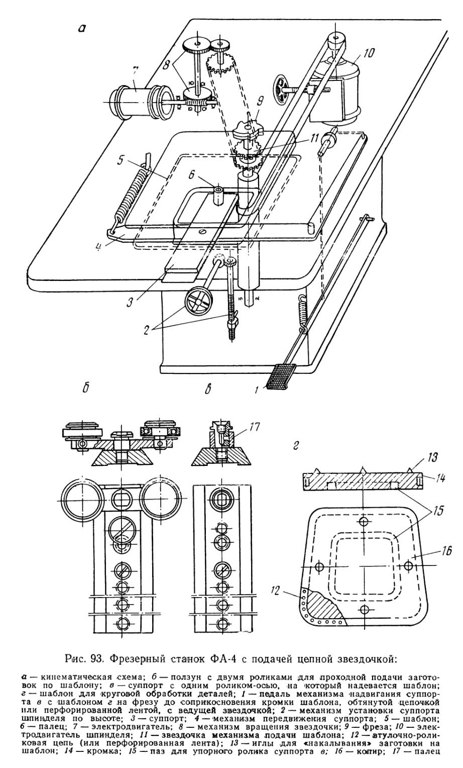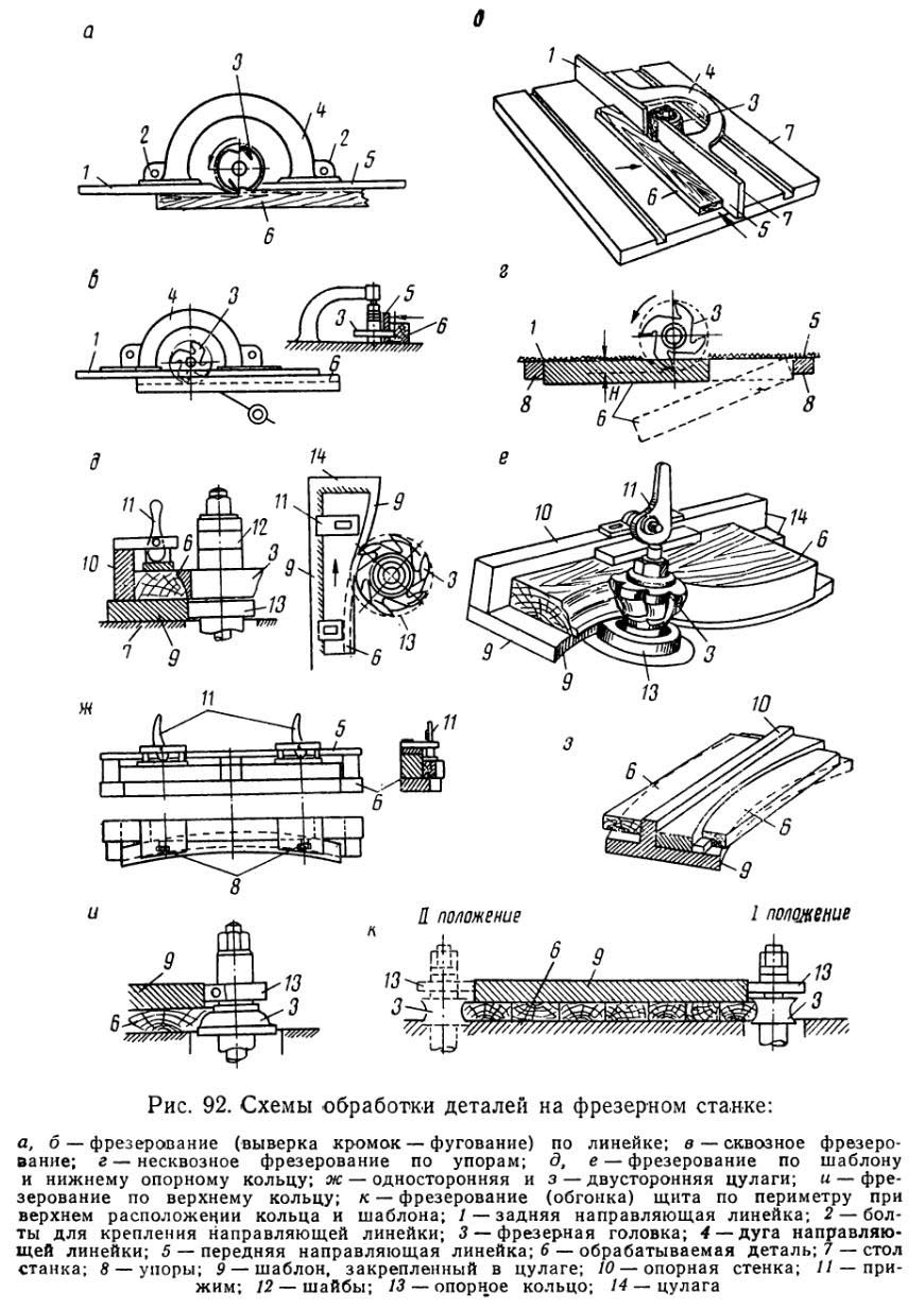 Прямолинейные детали фрезеруют з помощью направляющей линейки. Обрабатываемая заготовка кладется на стол вплотную к линейке, которая може быть закреплена на каретке под нужным углом к направлению руху, а сверху закрепляется прижимом. Обработка криволинейных деталей производится по шаблону, прижимаемому к кольцу, установленному в столе.