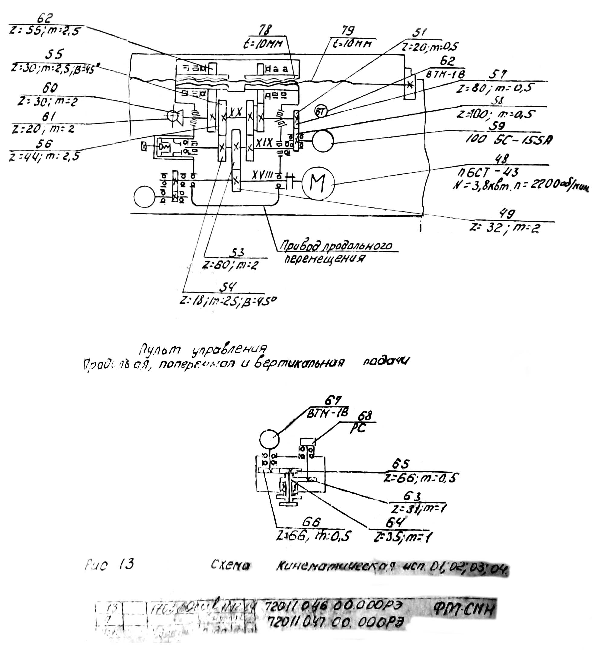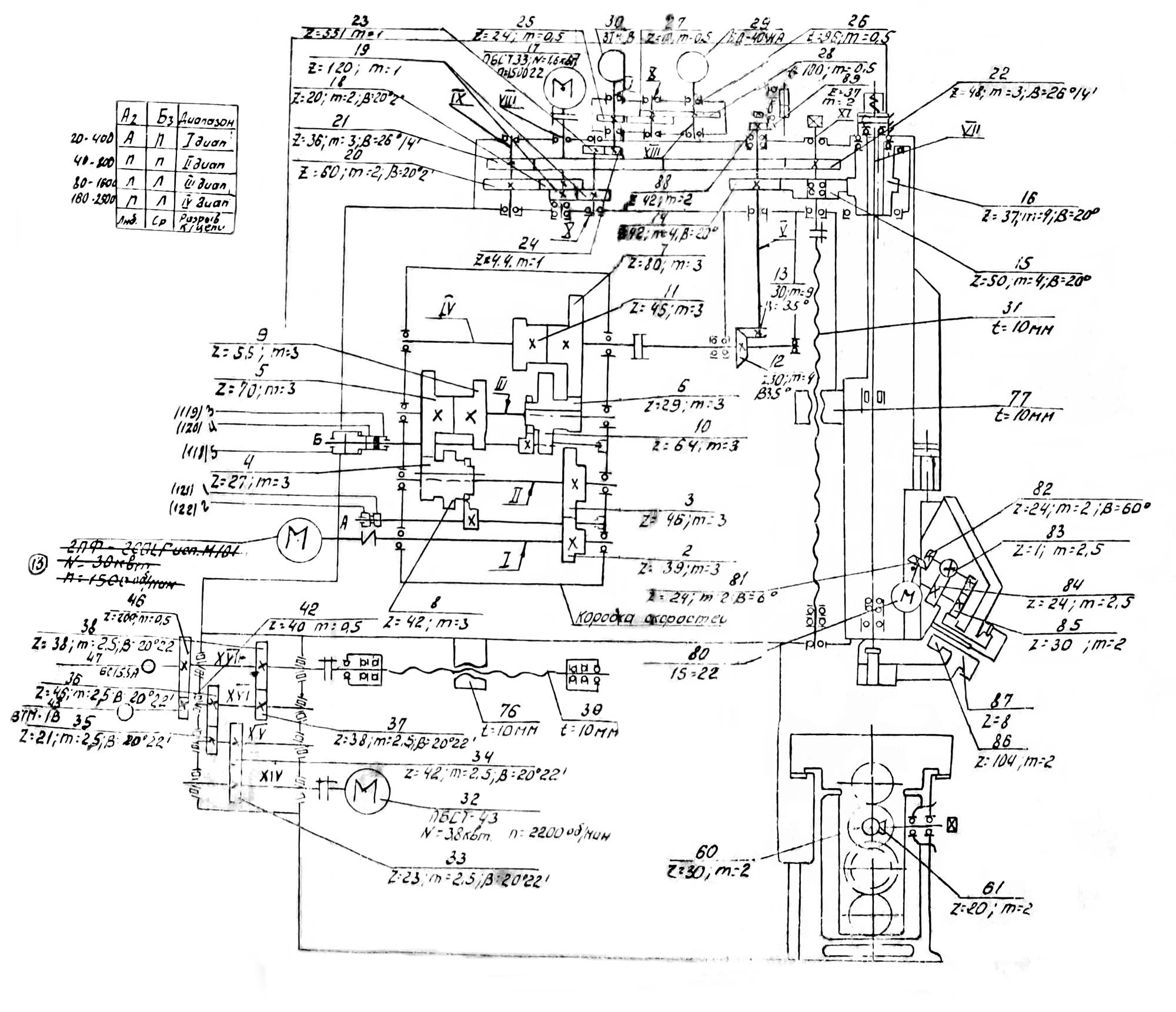 Кінематична схема бесконсольного вертикально-фрезерного верстата ФП-17. Дивитись у збільшеному масштабі