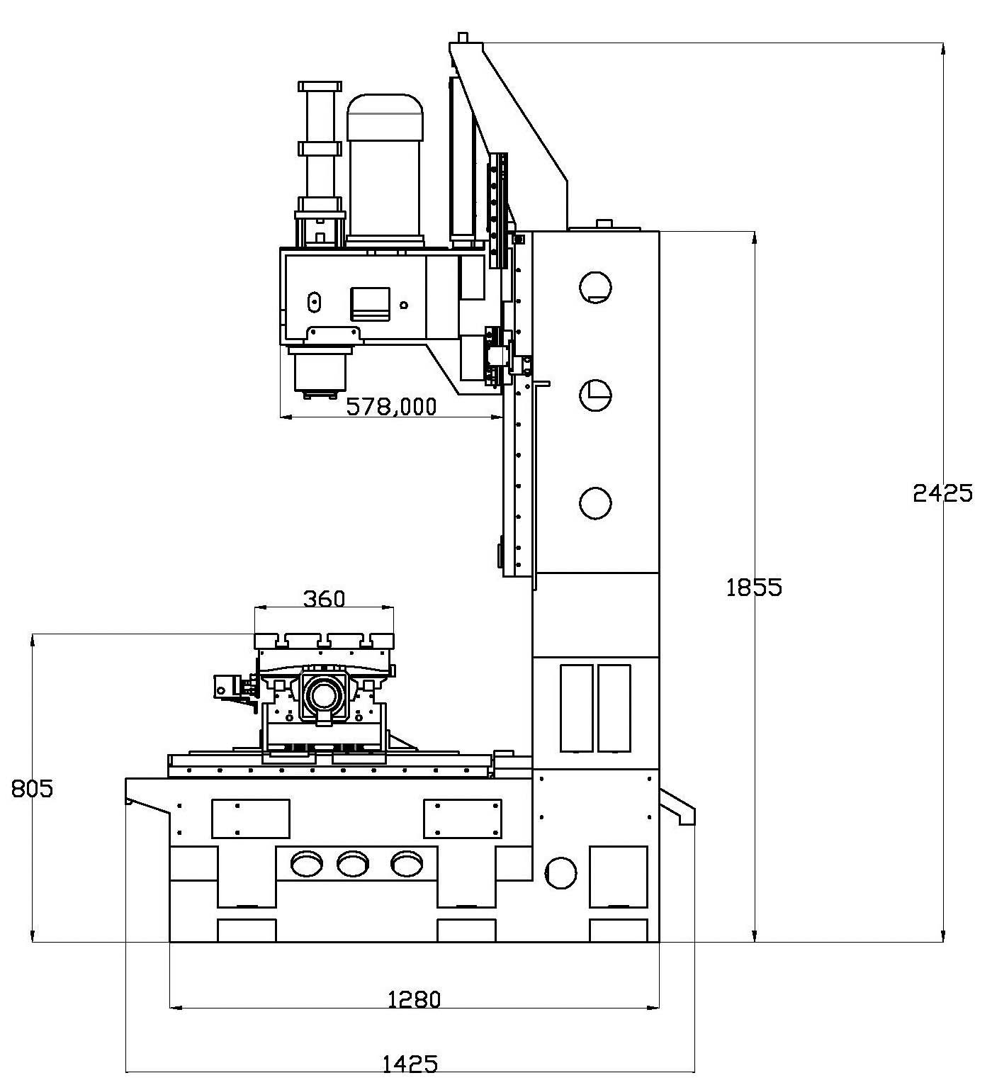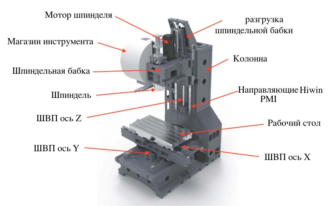 Основание, колонна і шпиндельна бабка образуют классическую С-образную конструкцию верстата. Надежность і долговечность вертикального фрезерного центра обусловлены прежде всего жесткостью основних несущих вузлів, высокие показатели которой в данной моделі достигаются благодаря чугунному литью елементів, усиленных внутренним поперечным і продольным оребрением. Такая конструкция позволяет гасить вибраций і обеспечивает высокую стойкость к изгибающим нагрузкам.