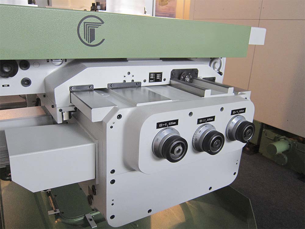 Продольное рух стола можно выключить при помощи переключающей системы рычагов в крестовой салазке. Этим возможен привід от аппаратов на столе до гладкого вала через левый подшипник стола. Кроме того, на крестовой салазке находится механізм попутной подачі для оси X і на передньої стороне находится кнопка для керування зажимным пристрійм. Только у FU 315/400 стол поворачиваем. Вместо крестовой салазки имеются салазка поворотной частини і поворотная часть.