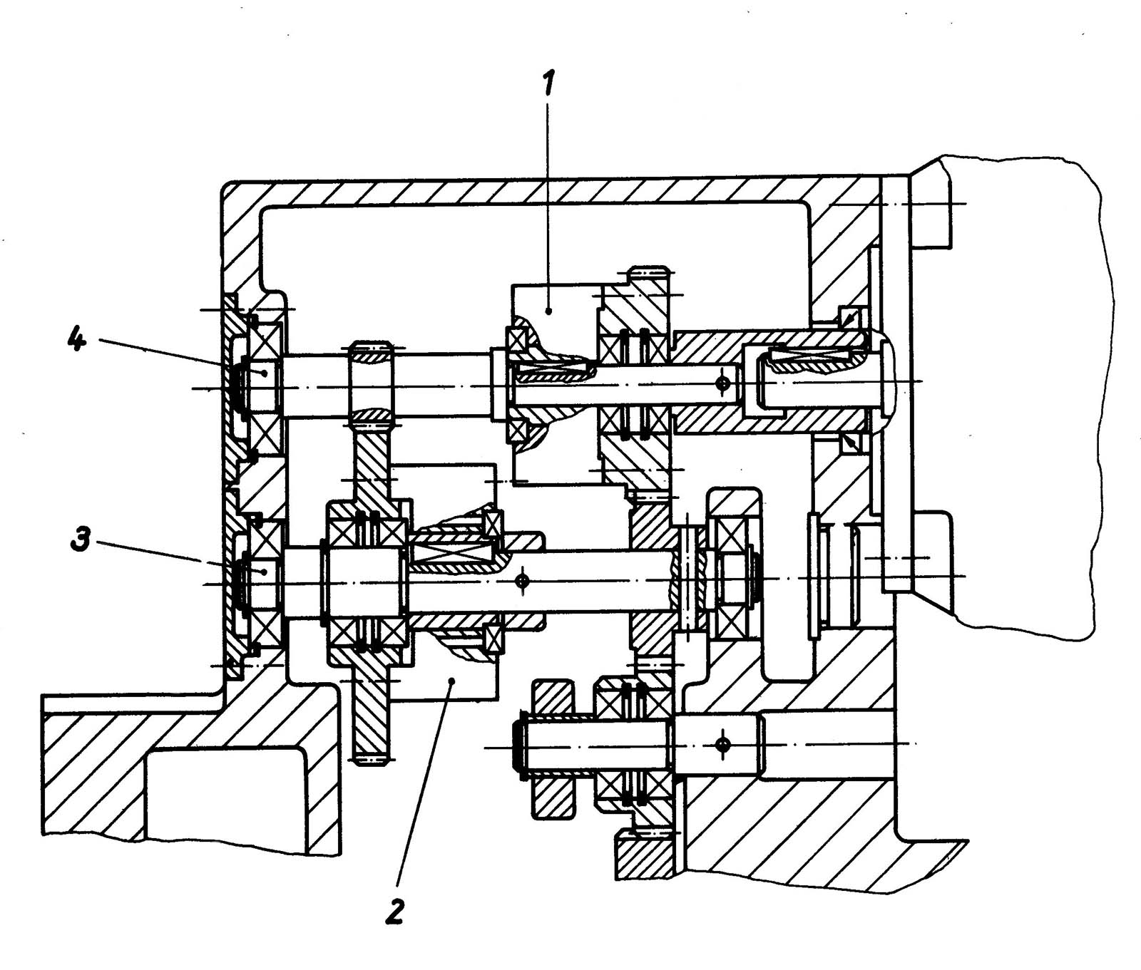 Привід осуществляется от головного двигуна I через двухступенчатую передачу на фрезерный шпиндель. При помощи двух електромагнітних дисковых муфт I і 2, рис. 2, осуществляется соответствующая ступень передачи.