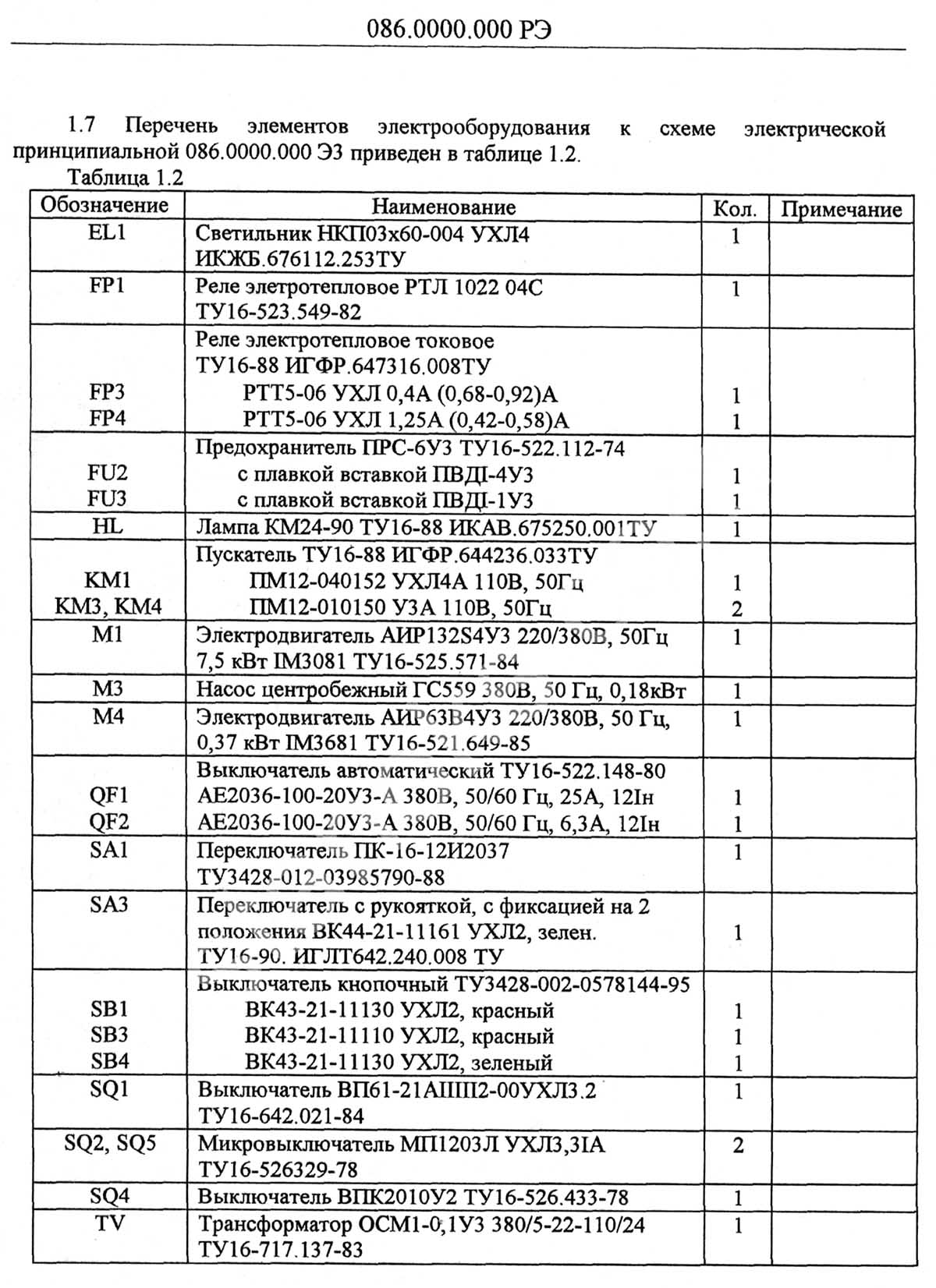 Полный состав електроустаткування верстата указан в перечне елементів 086.0000.000 ПЭ3 і приведен в таблице 1.2.