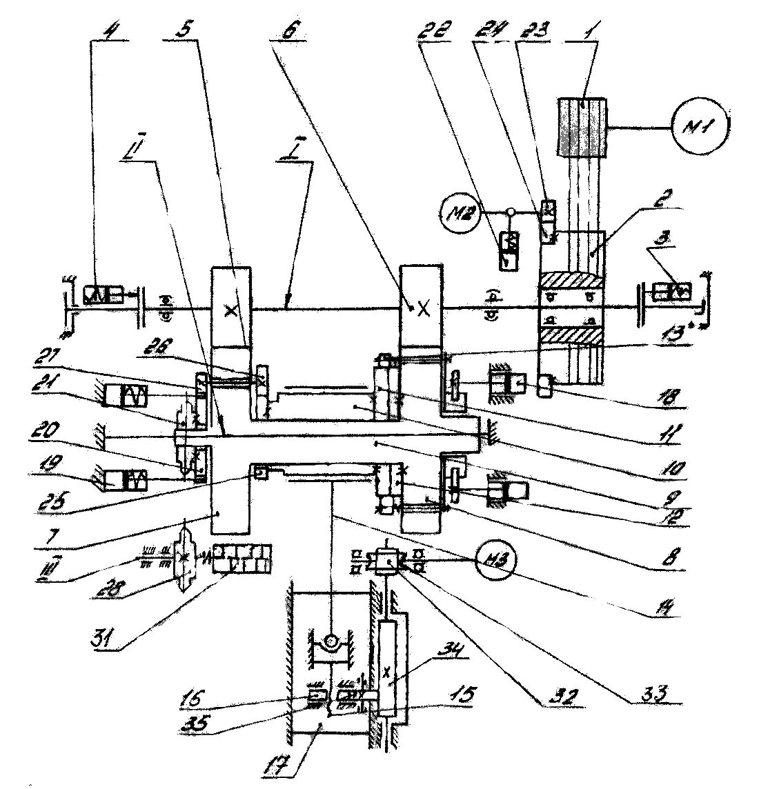 Крутящий момент електродвигуна М1 через шкив 1 передається на маховик 2 і далее при включенной муфте 3 і выключенном тормозе 4 – на приемный вал 1, на котором закреплены шестерни 5 і 6.