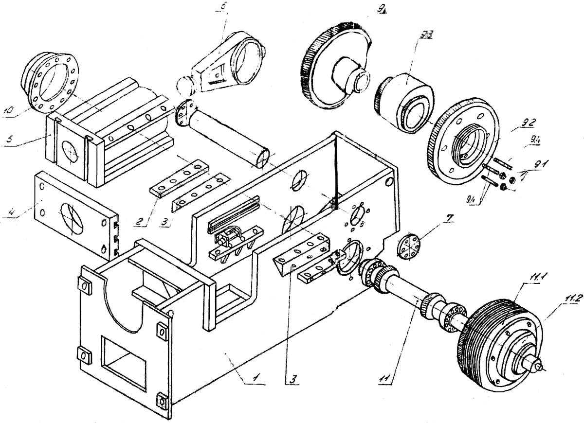 Шестерни 5 і 6 передают крутящий момент на зубчасті колеса 7 і 8, свободно вращающиеся на оси II. Колеса 7 і 8 жестко соединены о ексцентриком 9, на котором насажена ексцентриковая втулка 10, связанная з ексцентриком 9 посредством шестерен 11, 12 і обоймы 13. Шестерня 11 жестко соединена з ексцентриковой втулкой 10, а шестерня 12 – з колесом 8.