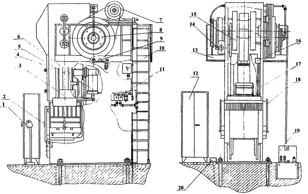 Муфта 3 і тормоз 4 предназначены для периодического соединения постоянно вращающегося маховика 2 з ползуном 17, воспринимающим технологическое усилие.