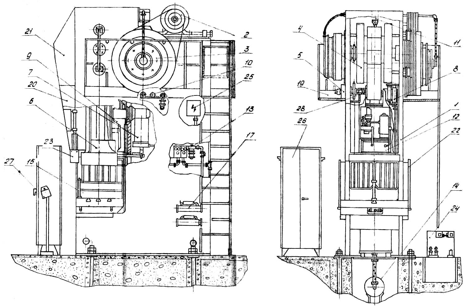 1. Розташування основних вузлів однокривошипного пресса КД2134. Дивитись у збільшеному масштабі