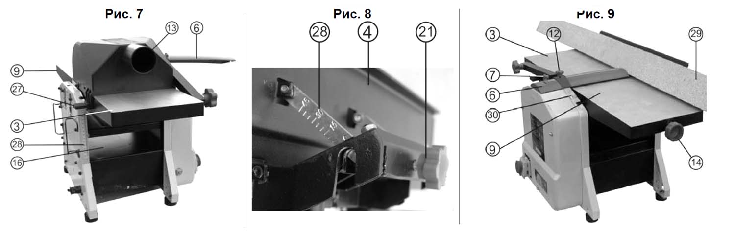 Оборудуйте машину для выполнения строгания (см. пункты 9.2.1-9.2.2). Поворотом маховика (14) установите высоту стола подачі (9), выбрав соответствующую глубину строгания по шкале (30), Рис.9. Установите защитную планку (6), как указано в пункте 10.2.