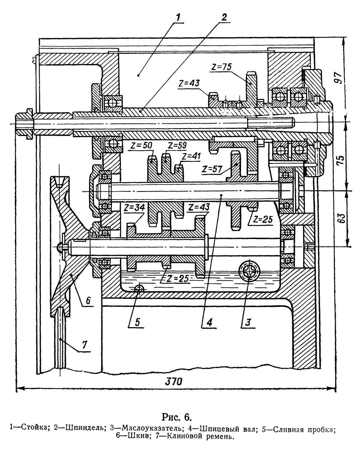 Подвижные блоки шестерен позволяют получить шесть различных частот обертання шпинделя (см. график частот обертання шпинделя).