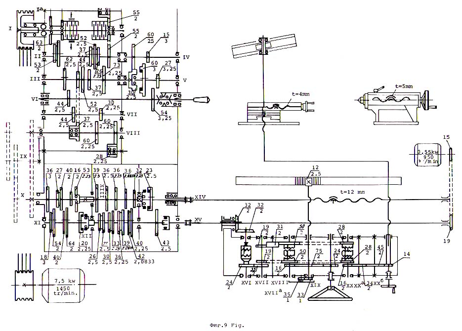 Схема кінематична токарно-гвинторізного верстата С11МТ. Дивитись у збільшеному масштабі