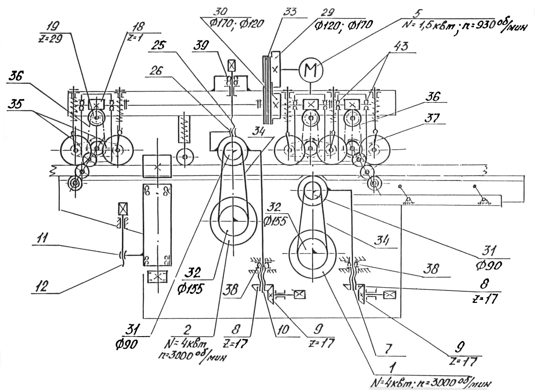 Кінематична схема четырехстороннего продольно-фрезерного верстата С16-42