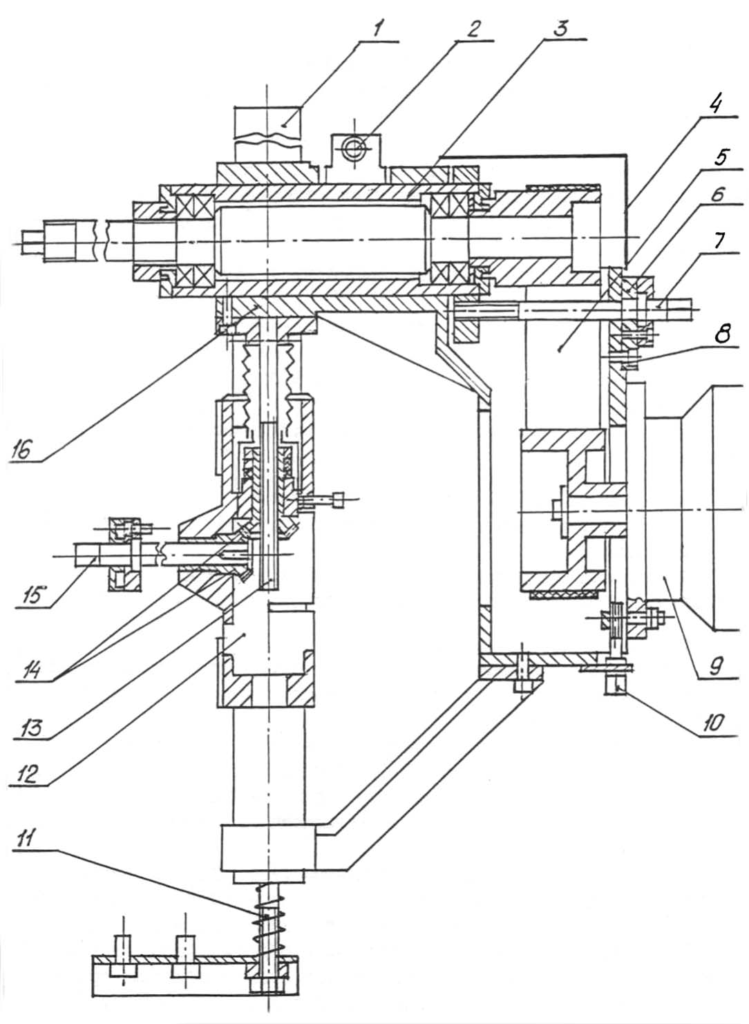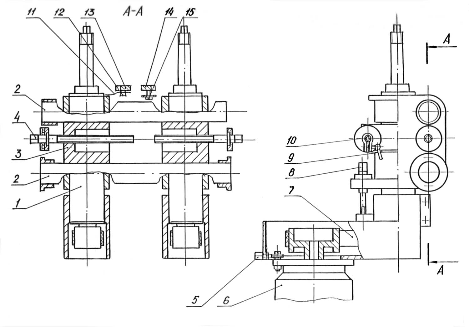 Шпиндель 3 смонтирован на подвижном корпусе 16, имеющим вертикальное перемещение со скалками 1 в плите 12, установленной на задньої стенке станины верстата. Вертикальное перемещение суппорта производится к4вадратом 15 через конические шестерни 14 і винт 13, а фиксация – квадратами 20 (рис. 1).