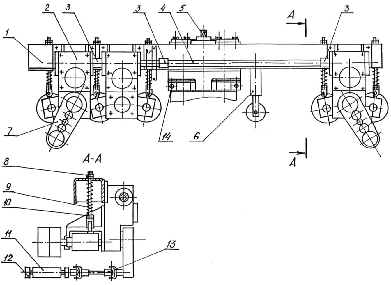 Прижим верхних приводных роликов к заготовке, необходимый для обеспечения соответствующего тягового зусилля подачі, осуществляется пружинами 9, усилие которых регулируется гайками 10. Для регулировки роликов в одной плоскости служат гайки 8.