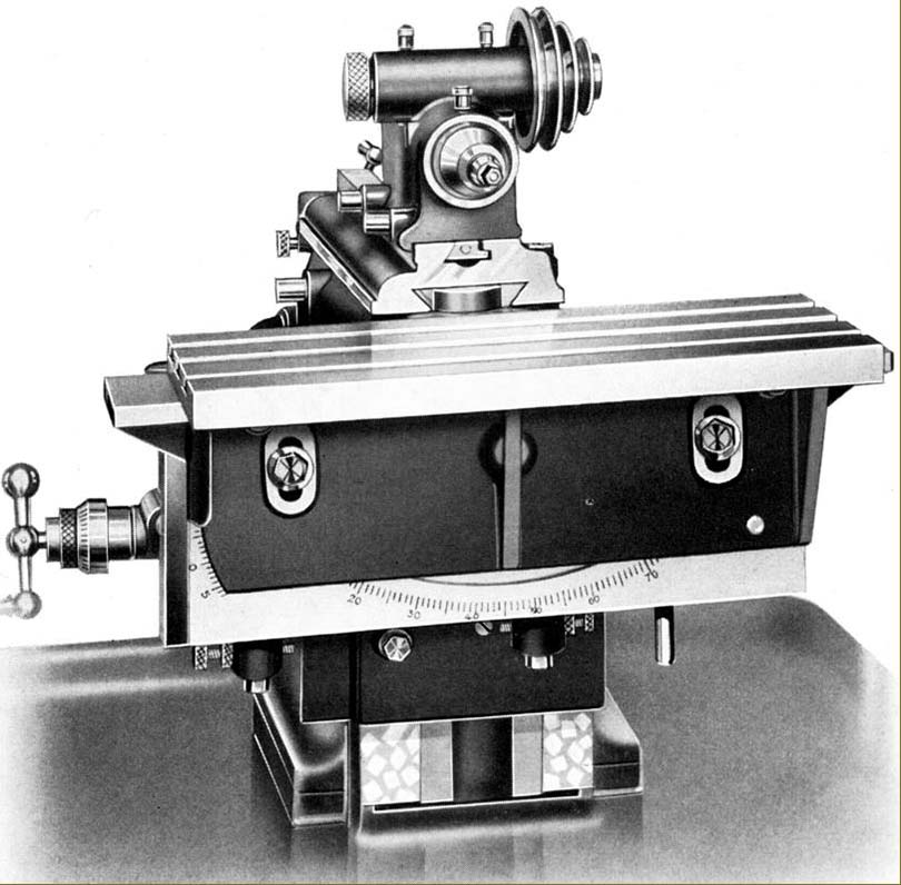 Фрезерна бабка має можливість за допомогою спеціального косинця, що закріплюється на верхніх санчатах, встановлюватись у вертикальному положенні