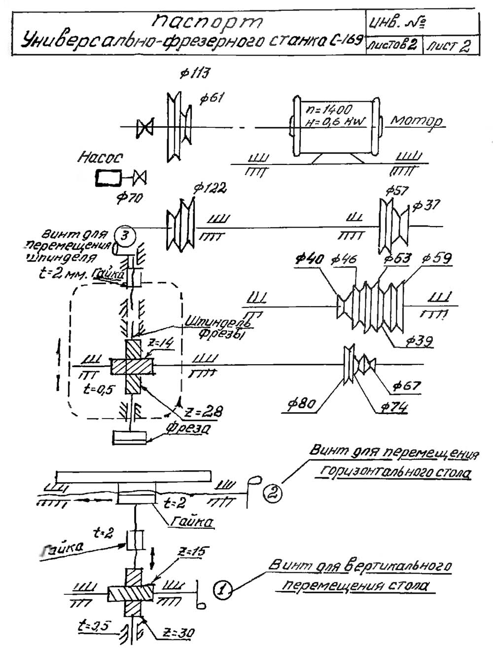 Кінематична схема фрезерного настільного верстата С-169. Дивитись у збільшеному масштабі