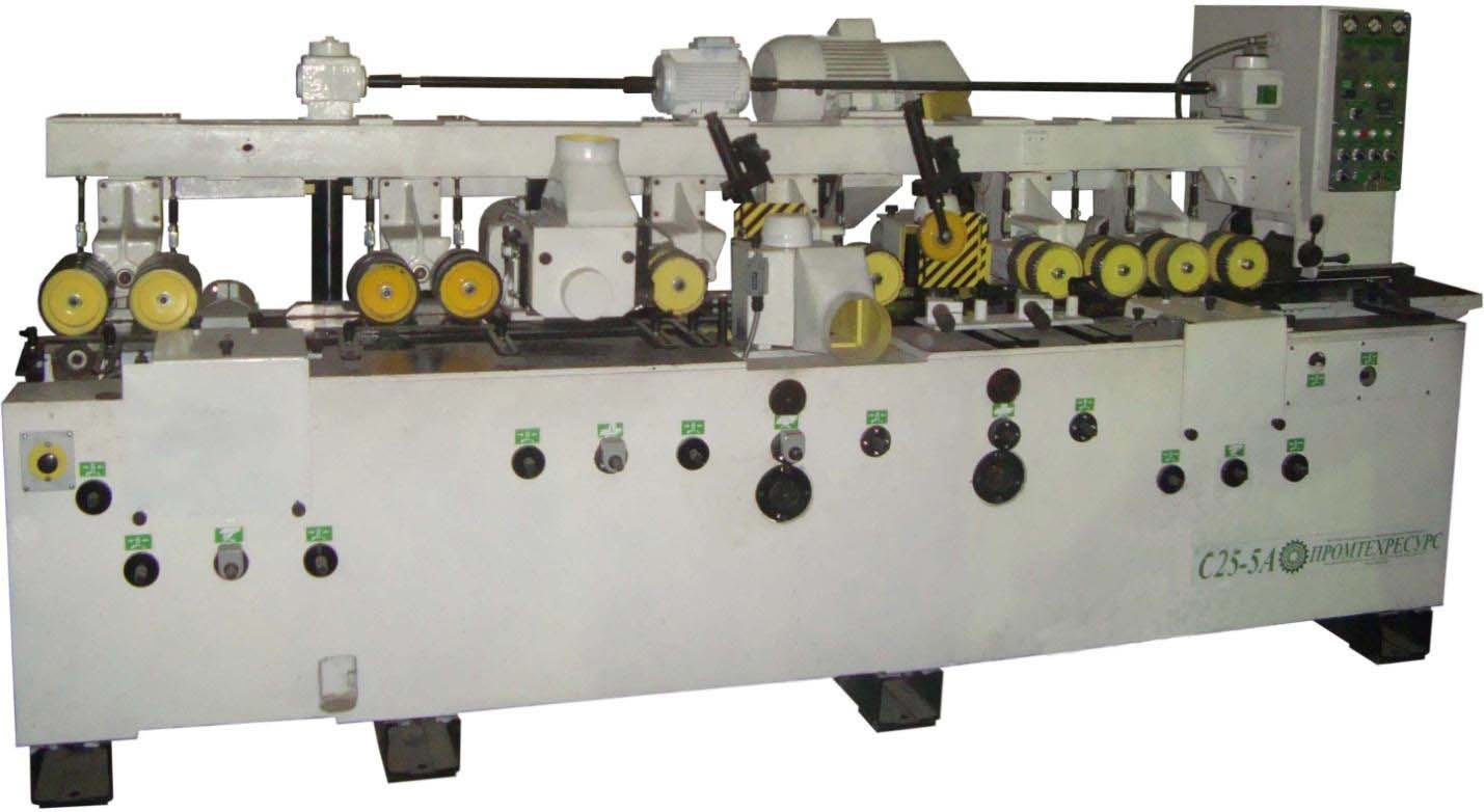 Верстат строгальный четырёхсторонний пятишпиндельный С25-5А універсального типа предназначен для четырёхстороннего плоского і профильного фрезерування досок, брусков і планок за один проход, а при оснащении соответствующим режущим инструментом – для строжки фасонных профилей, а также для делительных работ при обработке изделий толщиной до 55 мм.