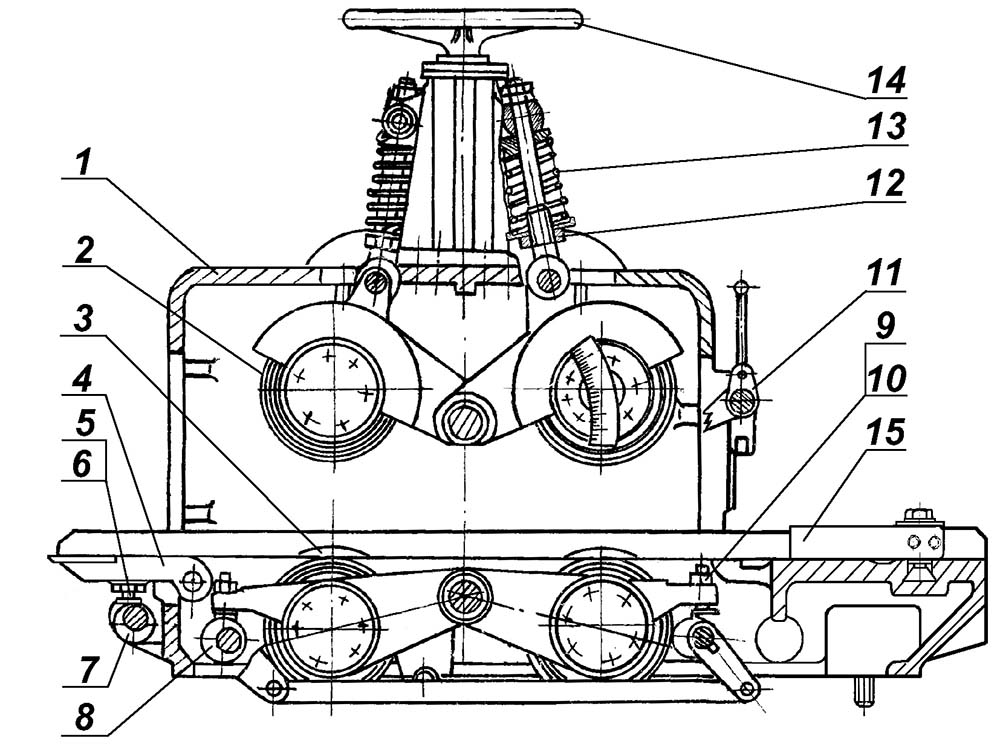 Прижим верхних вальцов к заготовке, необходимый для обеспечения соответствующего тягового усиления подачі, осуществляется регулируемыми пружинами 13.
