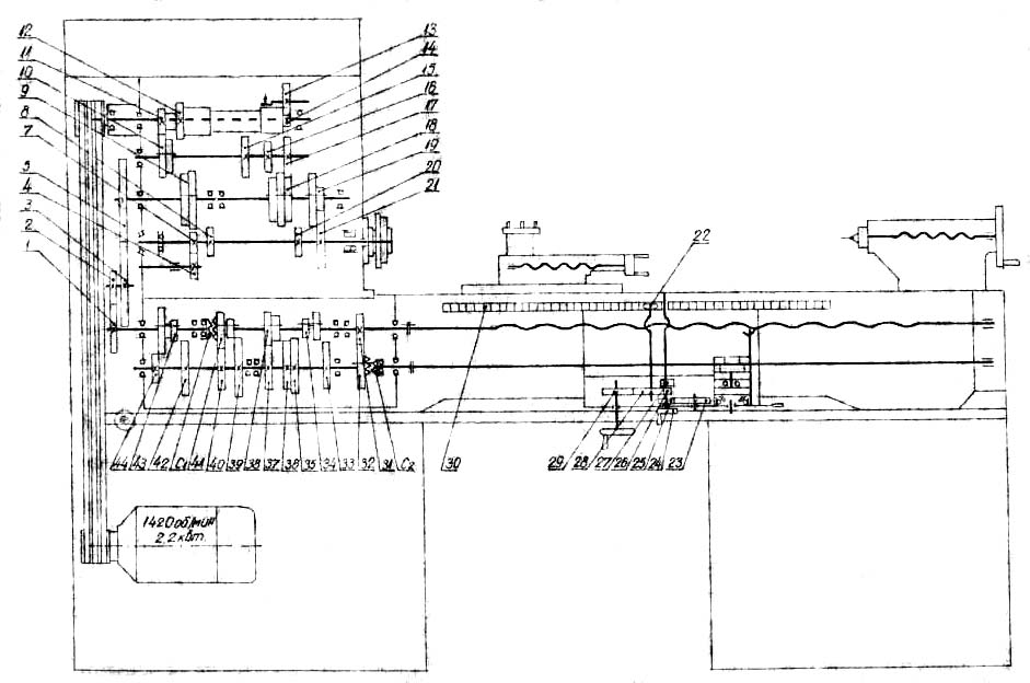 Схема кінематична токарно-гвинторізного верстата С8С. Дивитись у збільшеному масштабі
