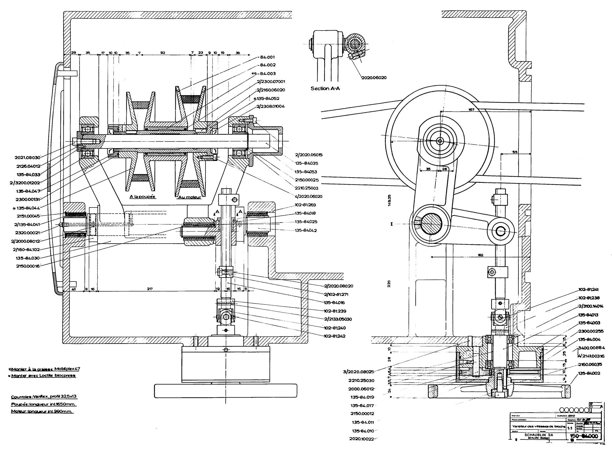 Регулятор числа обертів шпинделя (варіатор) складається з двох регульованих пар шківа для клинових ременів. В одній парі 150-84.002 знаходиться ремінь двигуна, в іншій парі 150-84.044 ремінь до шпиндельної бабки.