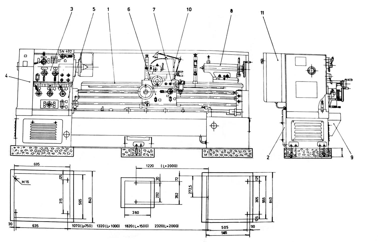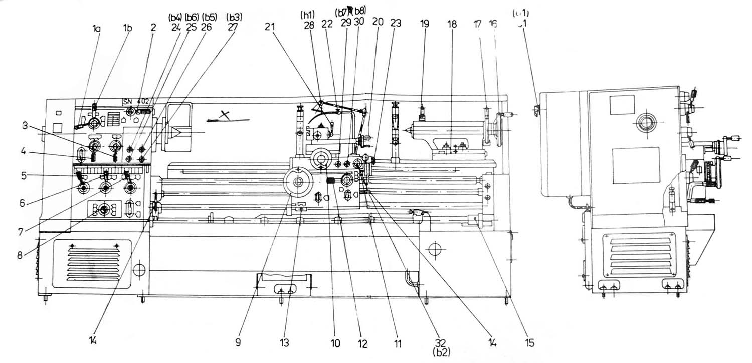 Розташування складових частинин токарно-гвинторізного верстата SN-402
