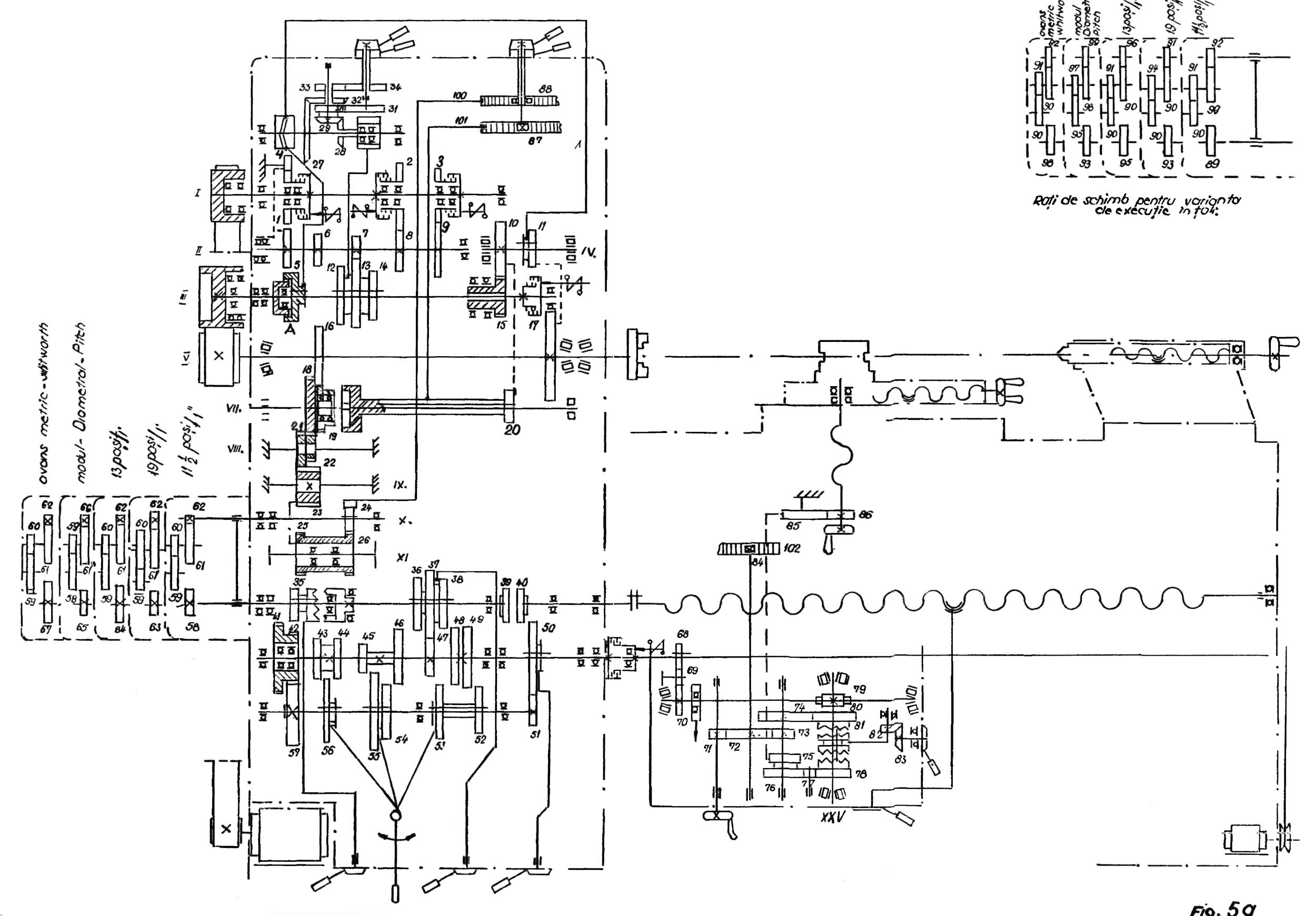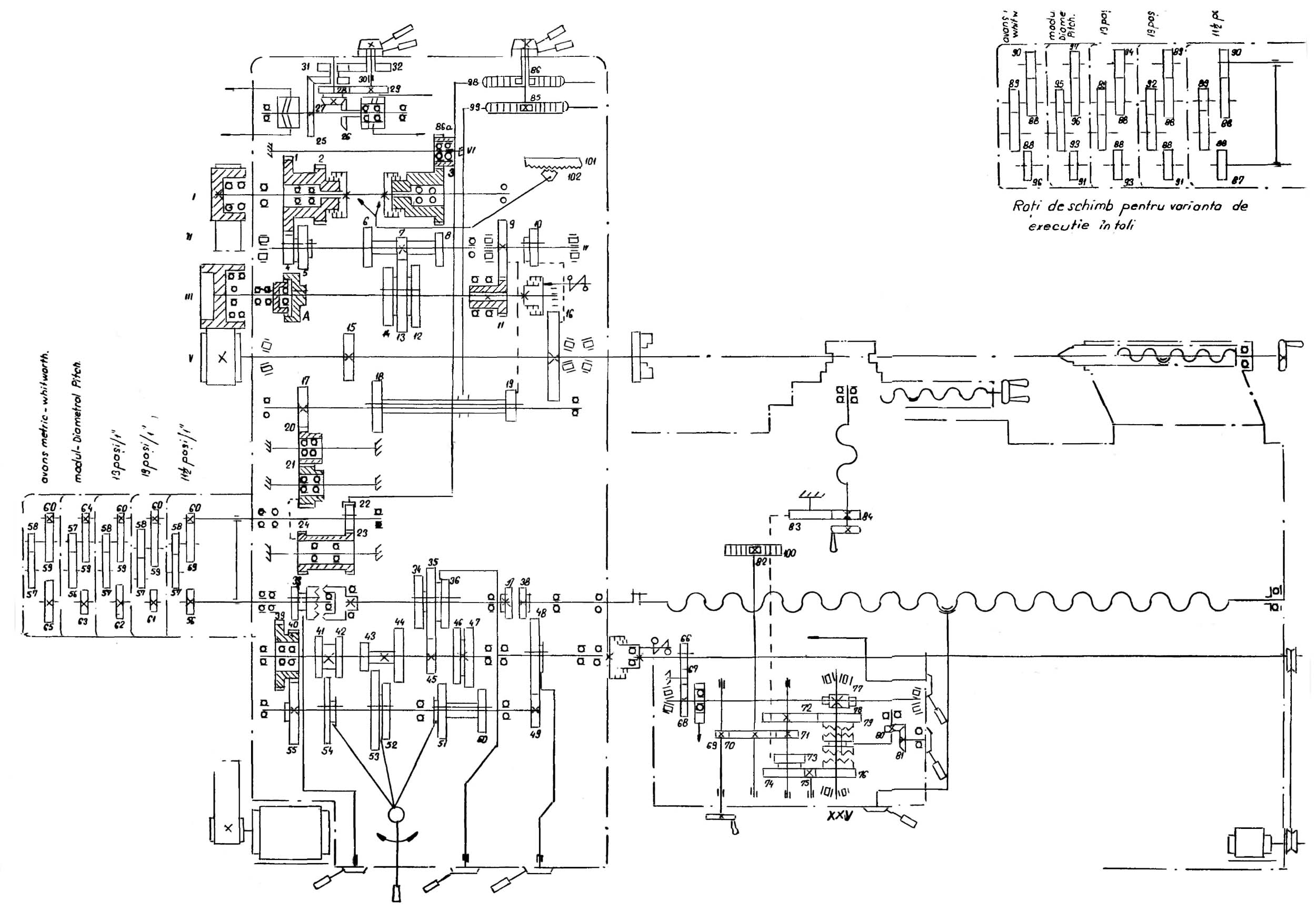 З кінематичної точки зору (див. рис. 5а або 5b) подачі та різьблення здійснені за допомогою передавальних чисел даних зачепленнями із зубчастиними колесами. Вибір цих передавальних чисел проводиться приводячи в дію (від керуючих рукояток на блоки пересування шестерень. Коробка подачі різьби включає 3 механізми.