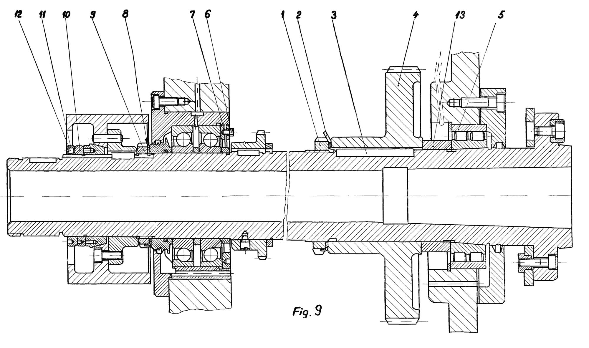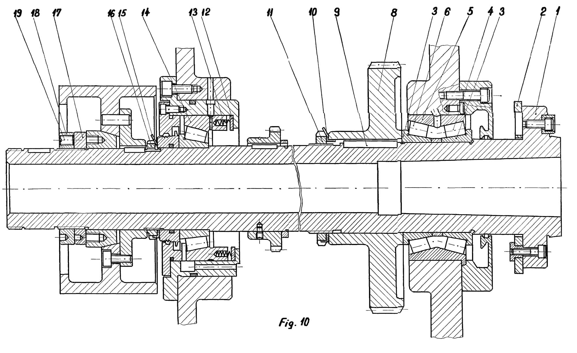 У разі капітальних ремонтів, коли шпиндель виймається, не знімається тільки внутрішнє кільце з клітиною з конічними роликами; зовнішнє кільце виймається тільки тоді, коли пружини не забезпечують більше силу попередньої напруги і необхідно їх замінити або доповнити. Стежити завжди за тим, щоб після того як знову встановлений підшипник кочення між передньою стороною зовнішнього кільця 14 і кільцем 12 існувала б відстань принаймні в 2 мм. Цей підшипник кочення встановлюється лише після того, як було встановлено та відрегульовано передній підшипник.