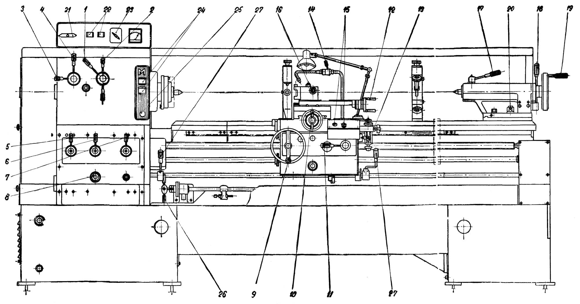 Привід в дію рукоятки коробки подач повинен мати місце тільки в тому випадку, коли кількість обертів шпинделя знаходиться в області 31,5-200 об/хв. У тому випадку, коли коробка швидкостей знаходиться у варіанті з електромагнітними муфтами (Е), рекомендується застосування кнопки імпульсу 25 рис. Під час дії цих рукояток.