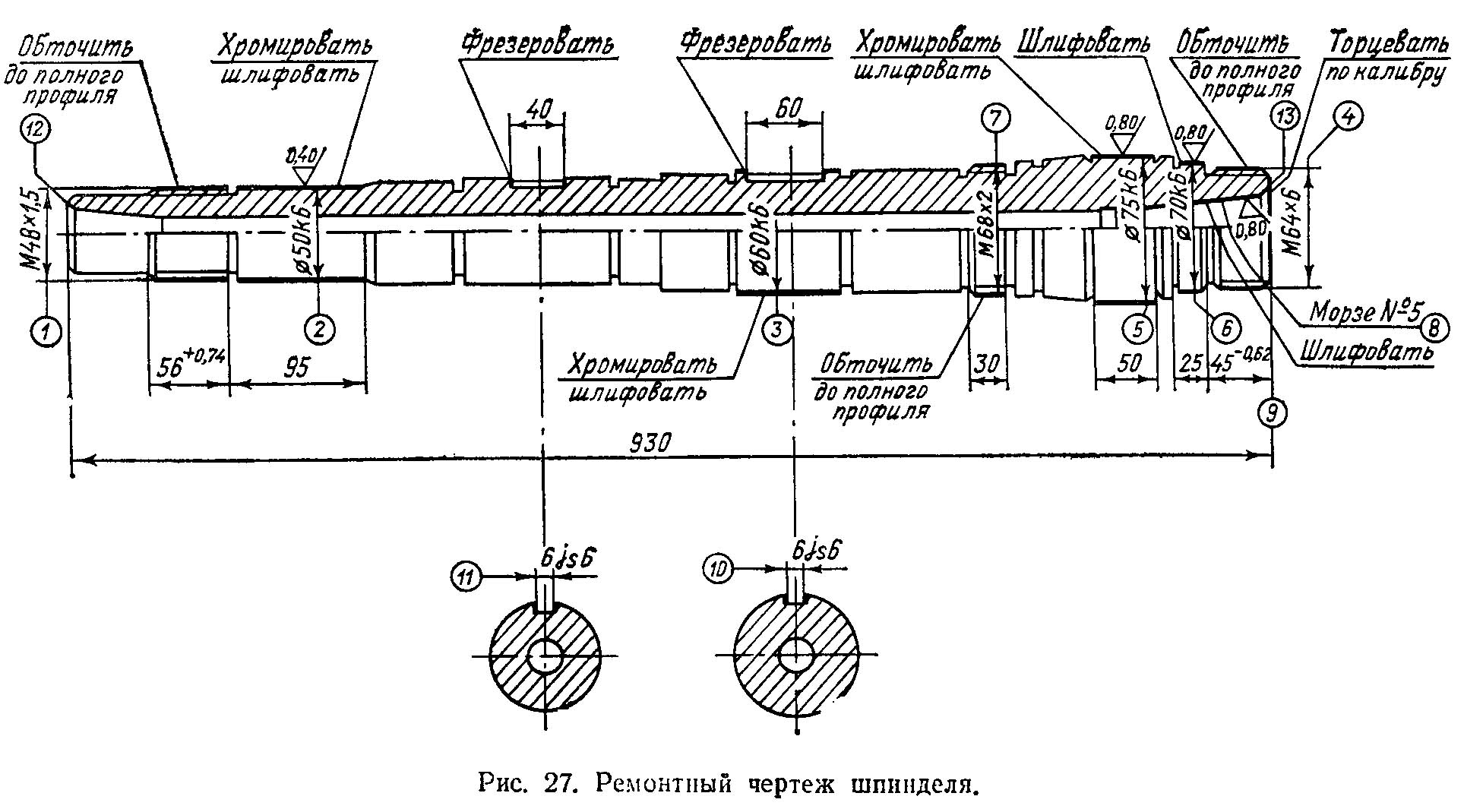 Ремонтный креслення шпинделя токарного верстата показан на рис. 27. В табл. 14 приведен технологический маршрут ремонта шпинделя.